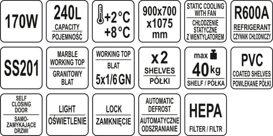 Stół chłodniczy 2-drzwiowy marki YATO YG-05275 z blatem roboczym z marmuru oraz nadstawką.