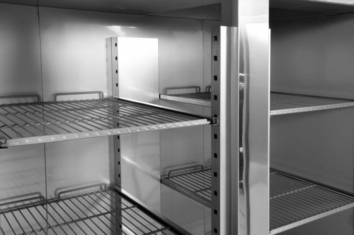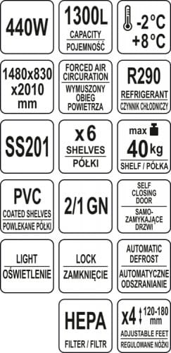 Model z samozamykającymi się drzwiami wyposażonymi w zamek oraz wygodnym uchwytem do otwierania. Na każde drzwi w zestawie są po 3 półki rusztowe powlekane PVC o nośności max 40kg - przy równomiernym obciążeniu. Umożliwia przechowywanie pojemników GN 2/1. Komora chłodnicza posiada oświetlenie.