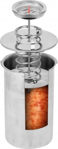 - Na środku wieczka znajduje się gniazdo z otworem umożliwiającym bezpośredni pomiar temperatury wsadu mięsnego. Służy do tego termometr z sondą.