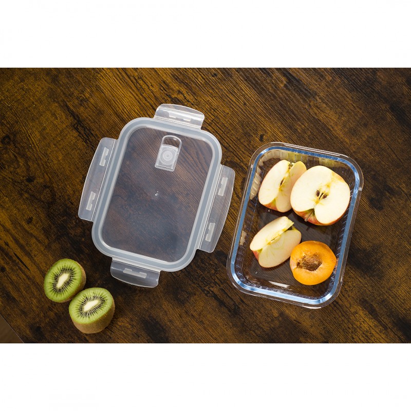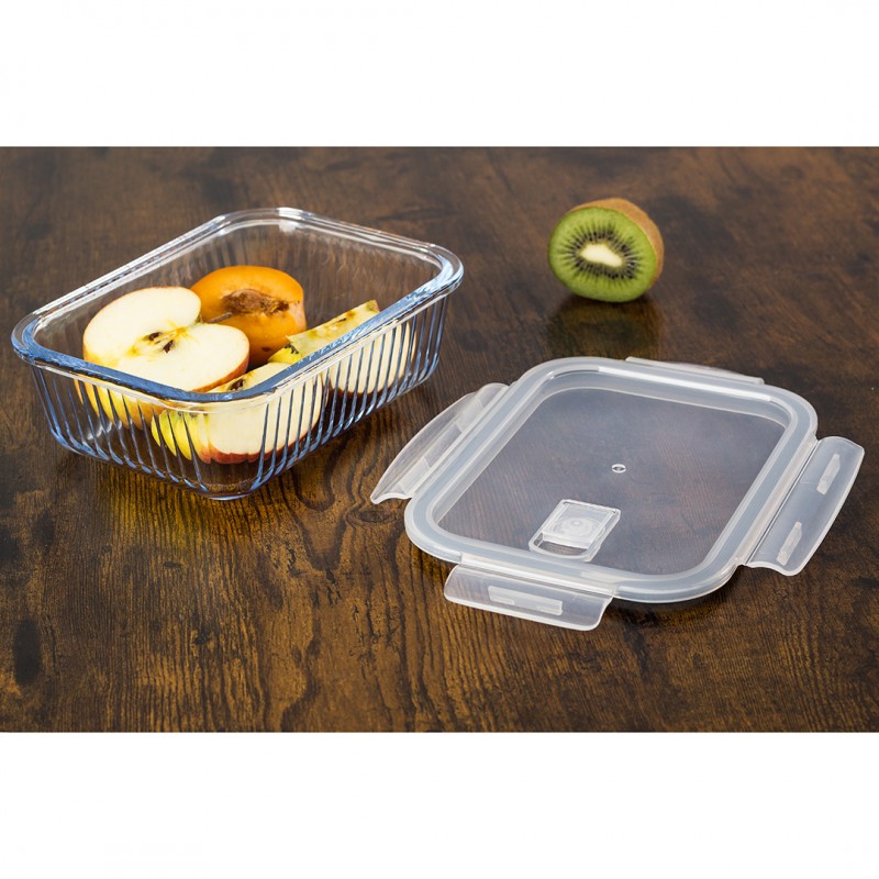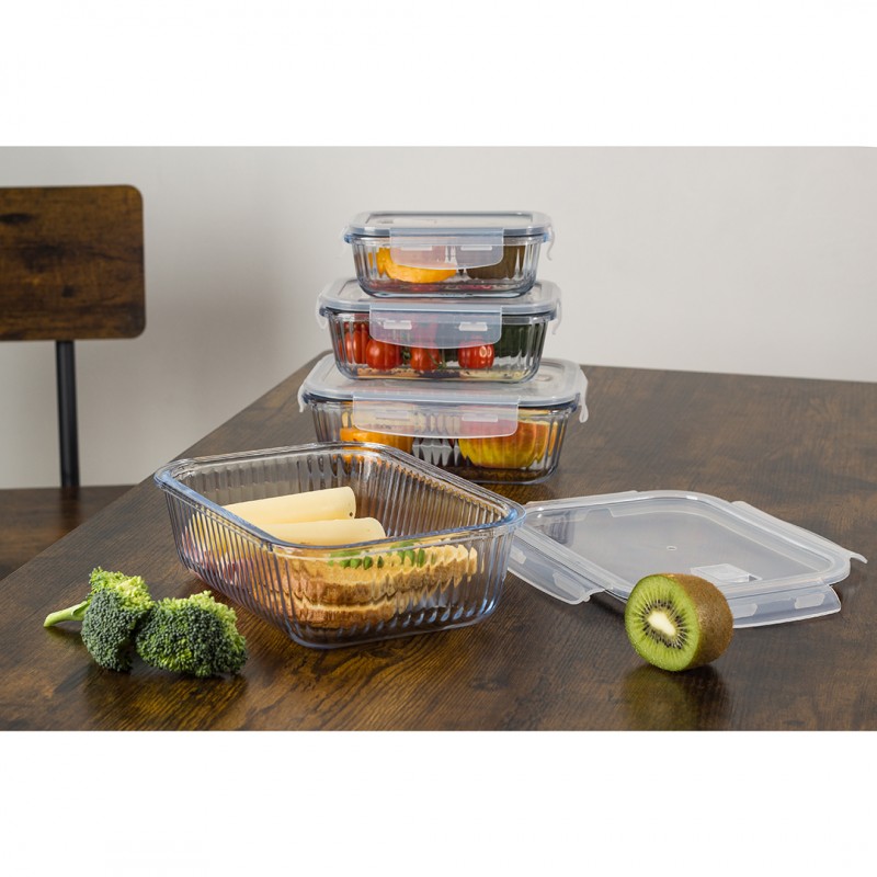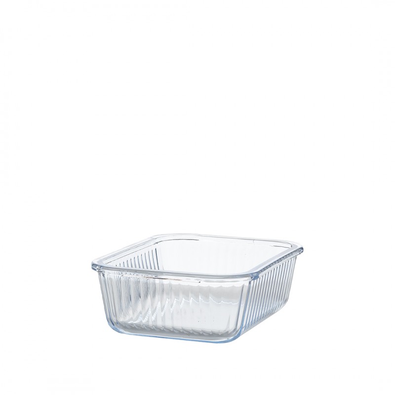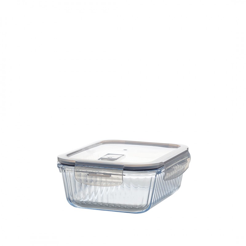 Nowoczesny design z ryflowanym szkłem nie tylko świetnie się prezentuje, ale również zwiększa trwałość pojemnika. Funkcjonalny, prostokątny kształt pozwala na wygodne przechowywanie – pełne pojemniki można układać jeden na drugim, a puste wkładać jeden w drugi, oszczędzając miejsce.