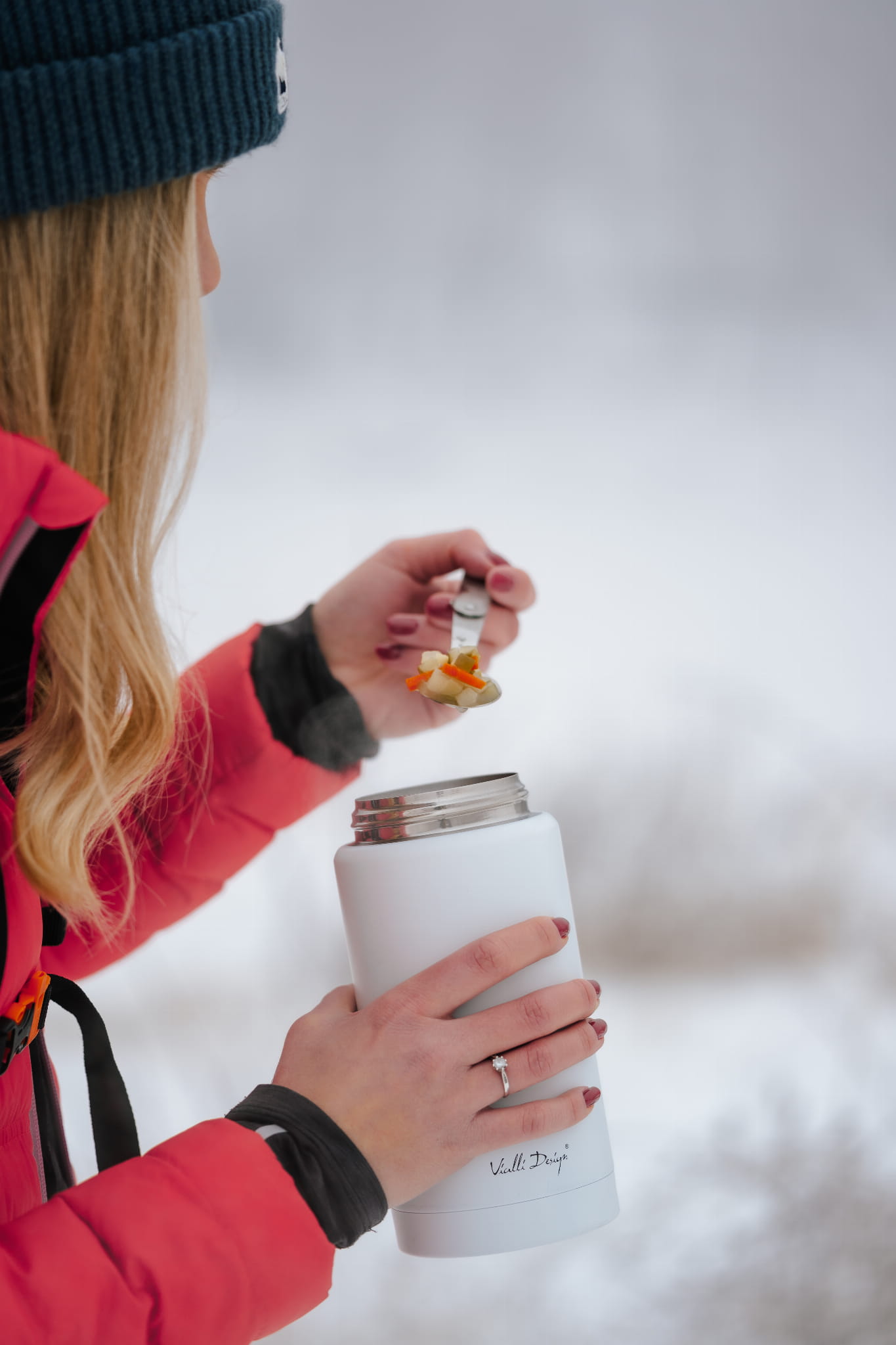 Aby jeszcze bardziej zwiększyć funkcjonalność termosu, dołączamy do niego specjalną łyżeczkę, którą można złożyć i schować pod nakrętką. Umożliwia to umieszczenie w środku zupy do posilenia się w trakcie długiej podróży.