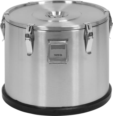 Pojemnik termoizolacyjny wyposażony jest w dwa wykonane ze stali nierdzewnej, masywne uchwyty ułatwiające transport oraz sześć zatrzasków zamykających pokrywę. Wysoka jakość i wytrzymałość tych elementów, gwarantuje wieloletnie bezawaryjne użytkowanie.