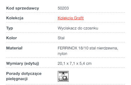 Wyciskacz do czosnku z łatwością poradzi sobie ze swoim zadaniem i doda smaku każdej potrawie. Wykonany jest z wysokowytrzymałej i wysokogatunkowej stali FERRINOX 18/10. Jest niekorozyjny, kwasoodporny i długo zachowuje swój pierwotny wygląd. Unikalna struktura pozwala zmielić czosnek bez marnotrawstwa. A funkcjonalne zęby z tyłu oczyszczą powierzchnię w ciągu kilku sekund.