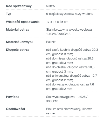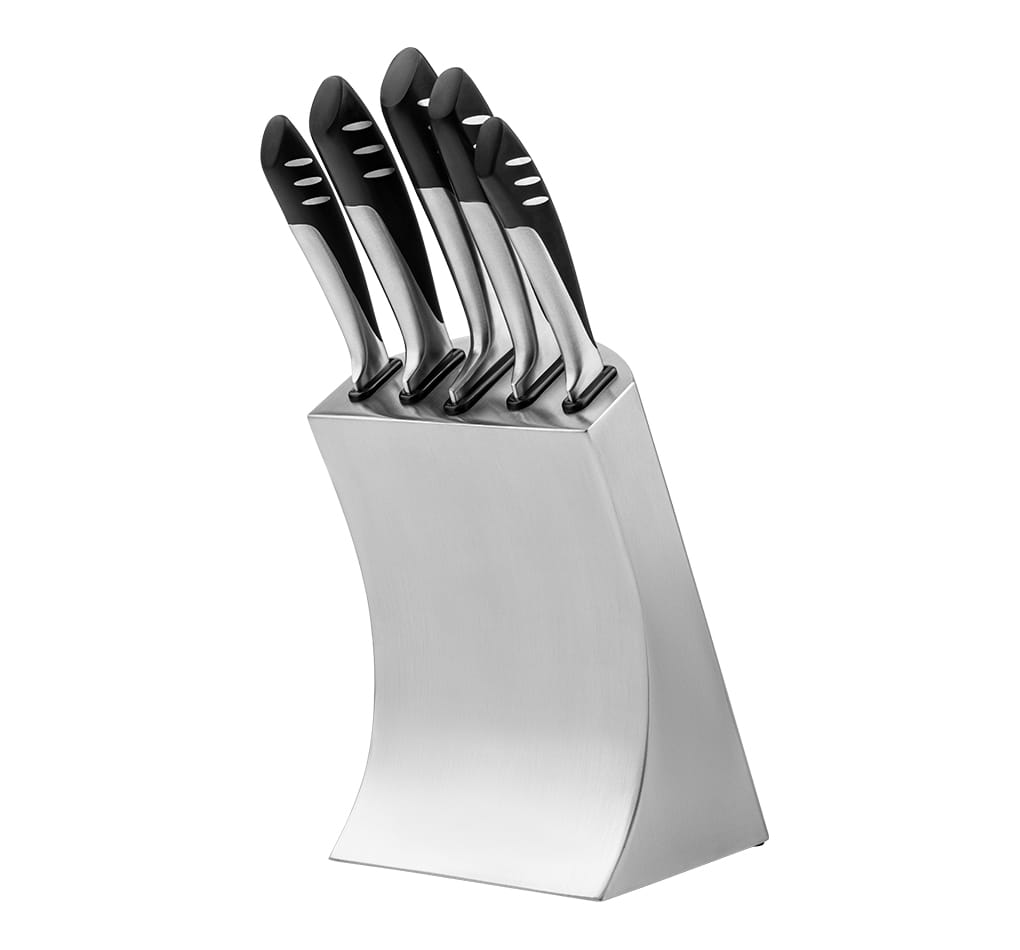 Stylowy zestaw noży kuchennych stanie się niezbędnym dodatkiem do każdej kuchni. Noże wykonane są z wytrzymałej stali wysokowęglowej, która nie odkształca się, nie koroduje i nie powoduje korozji. Ostre ostrze przez długi czas nie wymaga ostrzenia dzięki klinowej sekcji. Uchwyt wygodnie leży w dłoni, wykonany jest z bakelitu i nie ślizga się w dłoni. Stojak wykonany jest ze stali nierdzewnej i ozdobi każde wnętrze.