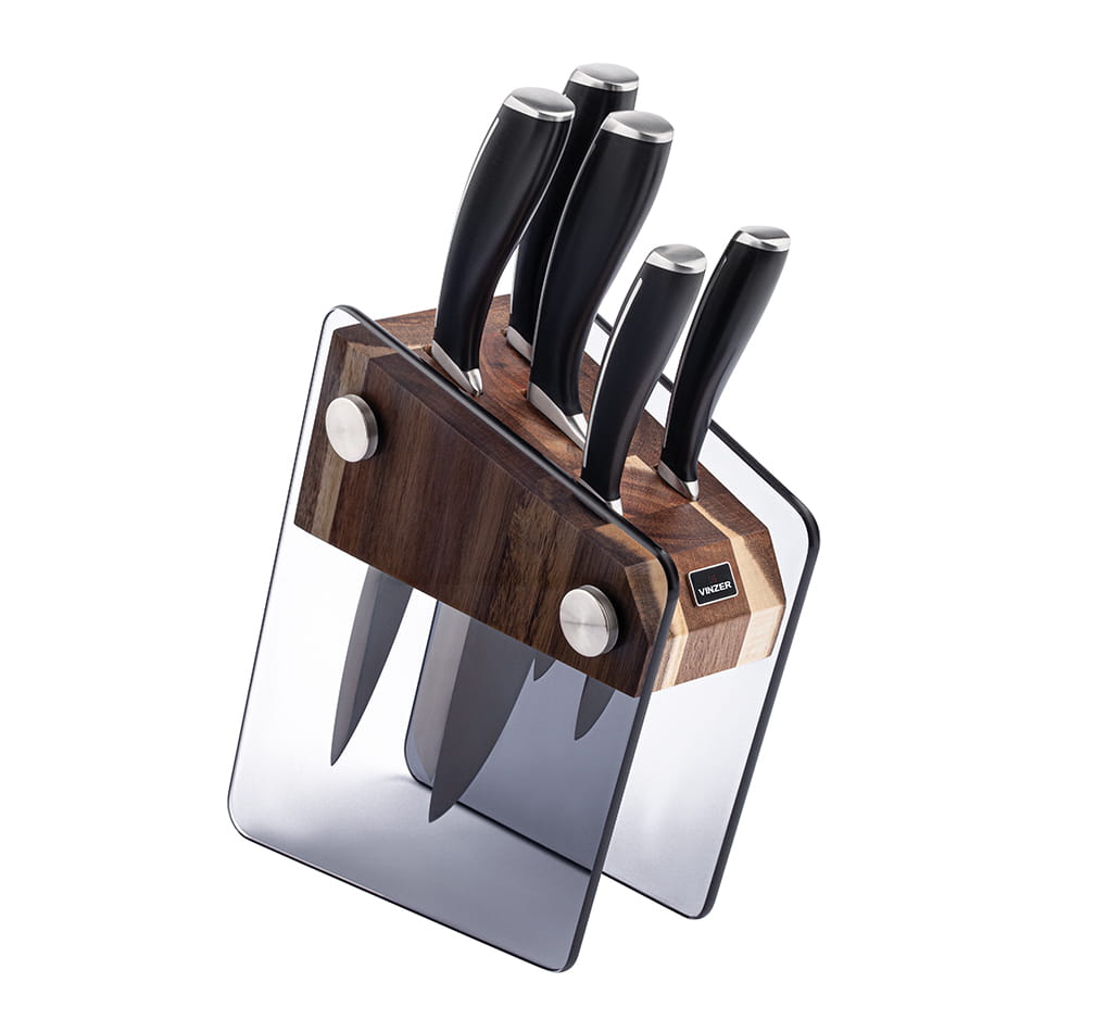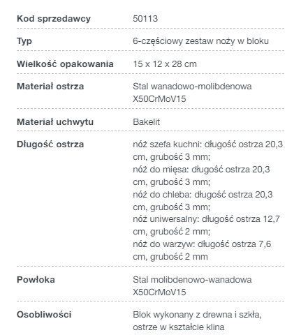 Stylowy zestaw noży stanowi idealną ozdobę nowoczesnych wnętrz i ułatwia codzienne przygotowywanie potraw. Ostrze noże wykonane są ze stali molibdenowo-wanadowej X50CrMoV15, odpornej na uszkodzenia mechaniczne i odkształcenia. Ostrze w kształcie klina pozostaje ostre przez długi czas i nie wymaga częstego ostrzenia. Uchwyty bakelitowe, nie zsuwają się podczas użytkowania. Blok wykonany jest z drewna z wstawkami ze szkła.