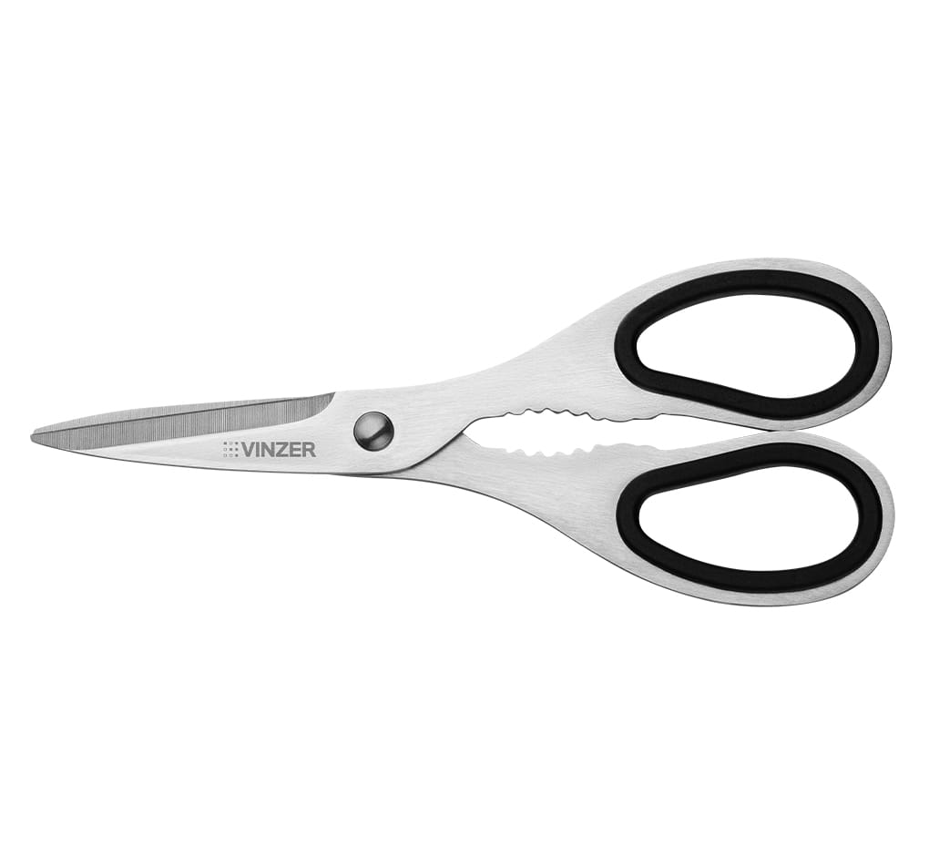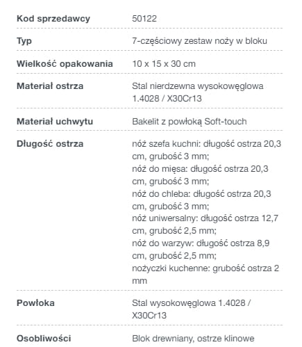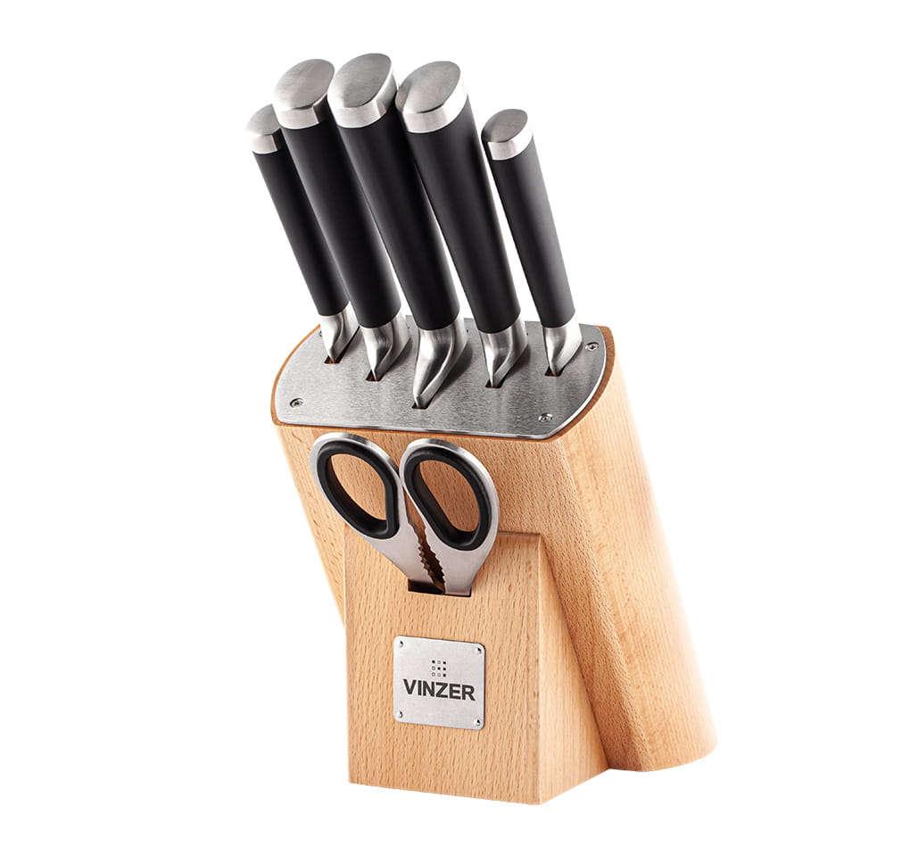 Stylowy zestaw noży uniwersalnych idealny do codziennego użytku. Zestaw składa się z 5 noży, nożyczek kuchennych oraz drewnianego stojaka. Noże wykonane są ze stali wysokowęglowej, odpornej na odkształcenia i uszkodzenia. Uchwyt wykonany jest z bakelitu, dobrze leży w dłoni i nie ślizga się podczas pracy dzięki powłoce Soft Touch. Ostrze ma przekrój w kształcie klina i długo zachowuje ostrość.