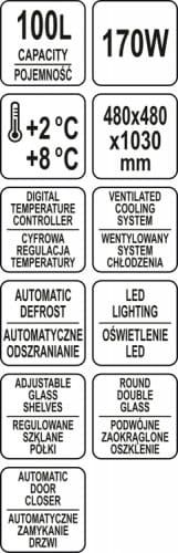 Nadstawka chłodnicza YATO ma pojemność 100L i posiada trzy półki z hartowanego szkła o regulowanej wysokości. Dostęp do nich odbywa się za pośrednictwem otwieranych drzwiczek szklanych z funkcją samo-zamykania. Wykonane są one ze szkła hartowanego, podobnie jak zaokrąglona szyba przednia. Zapewnia to dużą wytrzymałość, a jednocześnie bardzo dobre właściwości izolujące.
