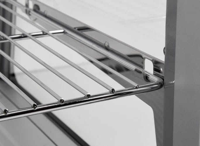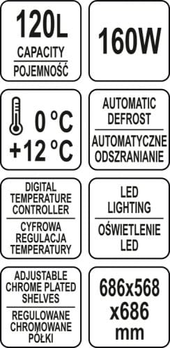 Nadstawka chłodnicza YATO ma pojemność 120L i posiada dwie chromowane półki o regulowanej wysokości. Dostęp do nich odbywa się za pośrednictwem przesuwanych drzwiczek szklanych. Wykonane są one ze szkła hartowanego, podobnie jak panoramiczna zaokrąglona szyba przednia. Zapewnia to dużą wytrzymałość, a jednocześnie bardzo dobre właściwości izolujące.