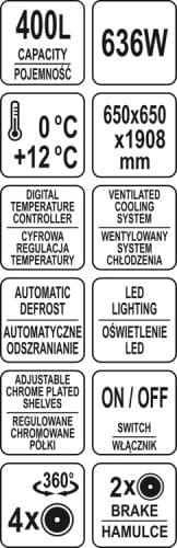 Witryna chłodnicza YATO ma pojemność 400L i posiada dwie wzmacniane i chromowane półki o regulowanej wysokości mocowania. Dostęp do nich odbywa się za pośrednictwem otwieranych drzwiczek szklanych. Wykonane są one z dwuwarstwowych szyb hartowanych, podobnie jak szyba frontowa i boczne. Zapewnia to dużą wytrzymałość, a jednocześnie bardzo dobre właściwości izolujące.