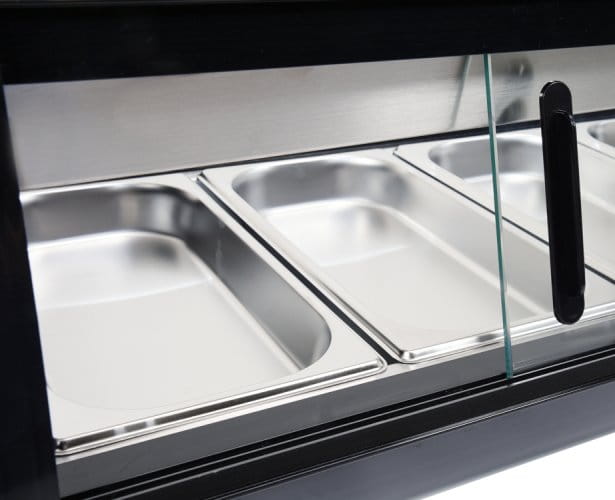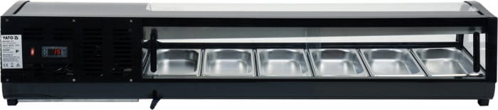 Nadstawka chłodnicza YATO mieści 5 pojemników GN 1/2 ze stali nierdzewnej, które są zawarte w zestawie. Dostęp do nich odbywa się za pośrednictwem przesuwanych drzwiczek szklanych. Wykonane są one ze szkła hartowanego, podobnie jak panoramiczna zaokrąglona szyba przednia. Zapewnia to dużą wytrzymałość, a jednocześnie bardzo dobre właściwości izolujące.