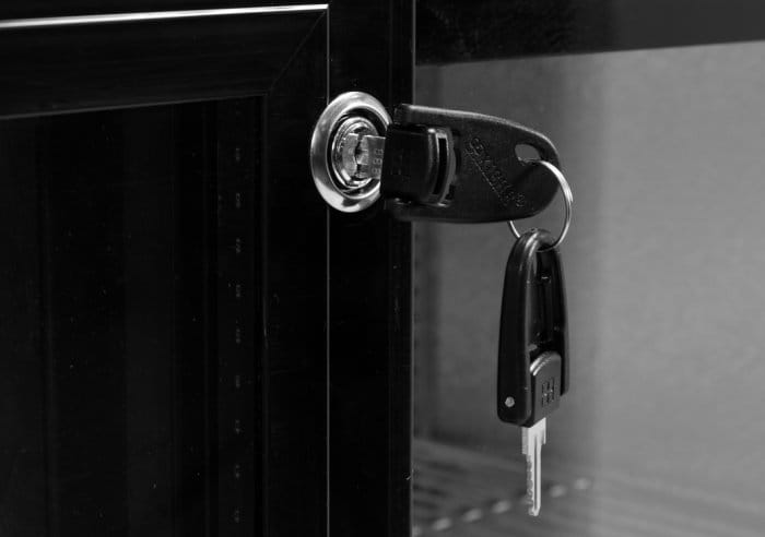 Witryna posiada 2 drzwi przesuwane wykonane ze szkła hartowanego. Dodatkowo wyposażone są one w zamek na kluczyk umożliwiający zabezpieczenie zawartości przed kradzieżą. W środu zainstalowane są 4 półki chromowane o nośności max 40kg - przy równomiernym obciążeniu.