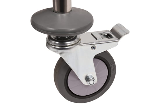 Wózek wyposażony jest w 4 kółka z łożyskami, wykonane z wysokiej jakości szarego TPR. Zastosowanie twardego, a jednocześnie elastycznego materiału zapewnia bardzo cichą pracę. Kółka nie rysują posadzki, nie pozostawiają na niej śladów i są skrętne w zakresie 360°. Umożliwia to manewrowanie w trudno dostępnych pomieszczeniach i wąskich korytarzach. Dwa kółka wyposażono dodatkowo w hamulce.