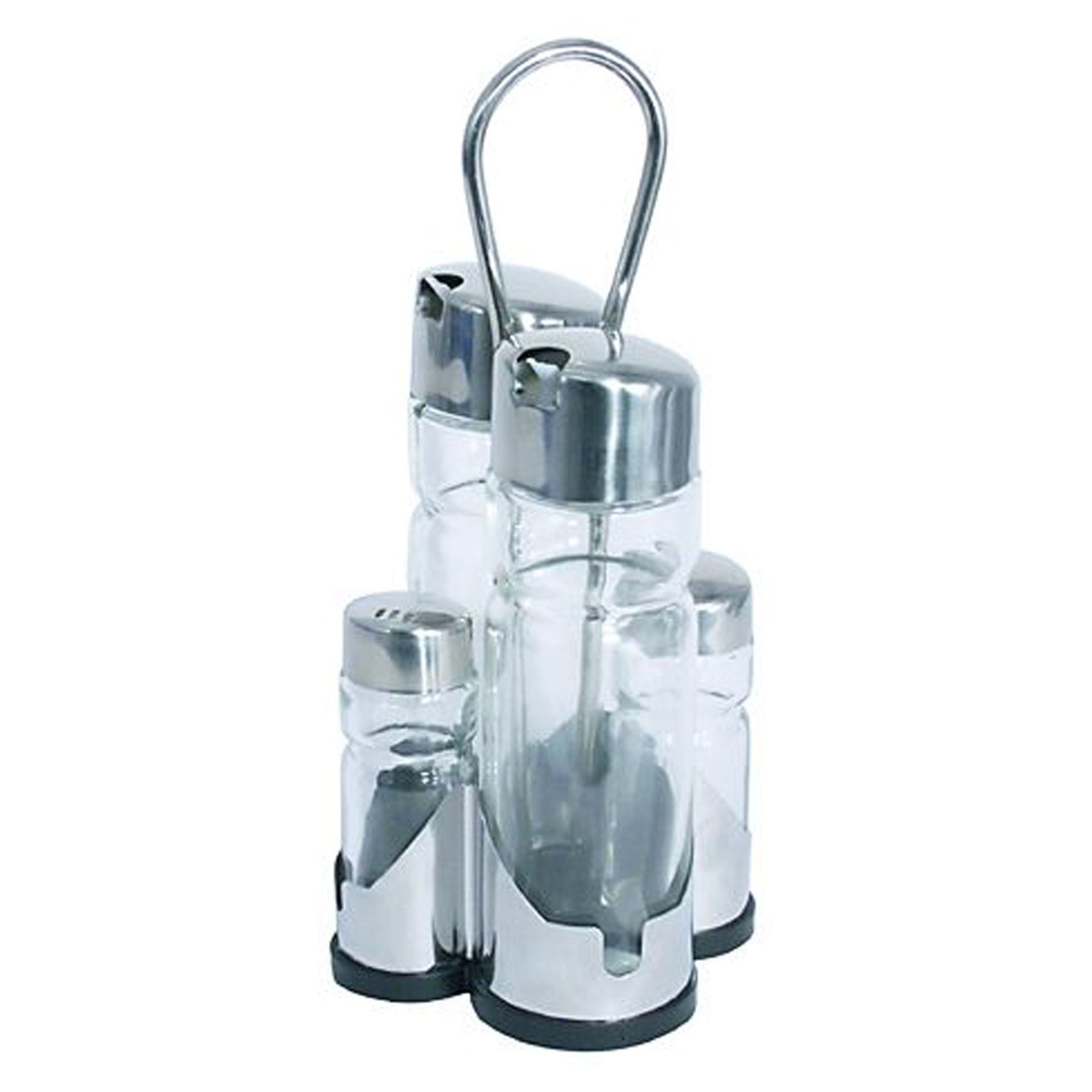 - w skład zestawu wchodzą: pojemnik na sól, pojemnik na pieprz, pojemnik na oliwę, pojemnik na ocet oraz podstawa