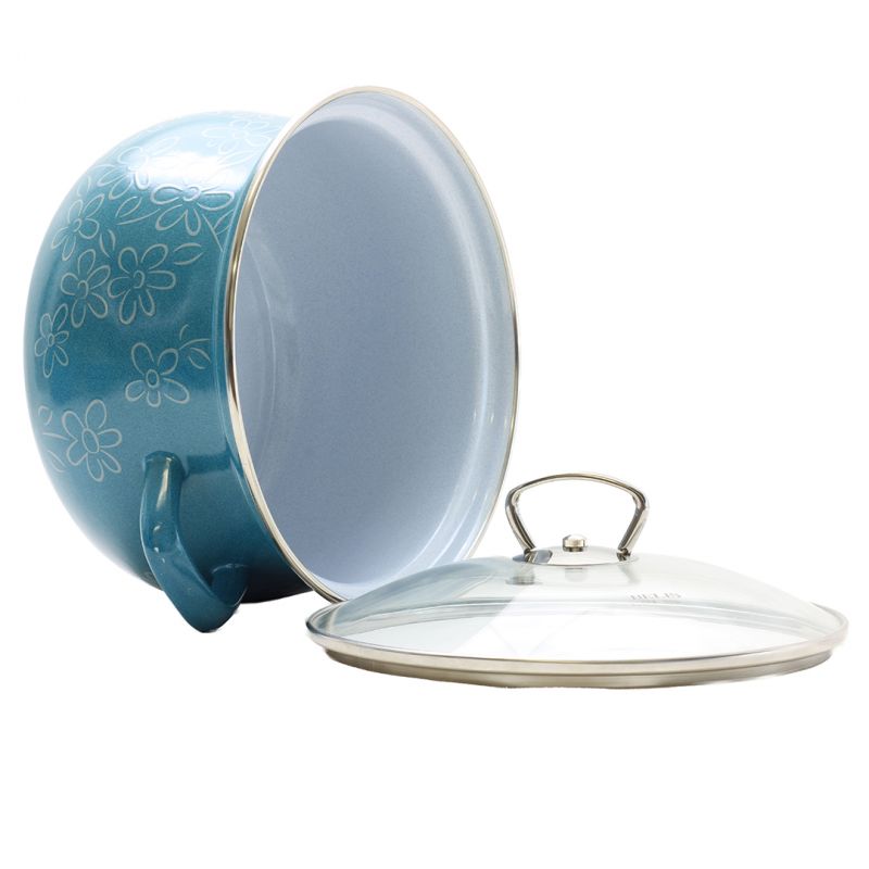 Wprowadź do swojej kuchni wyjątkowe połączenie elegancji, funkcjonalności i trwałości. Zestaw garnków BELIS FLOWER to komplet czterech emaliowanych naczyń z pięknymi, szklanymi pokrywkami. Ich unikalny design z ręcznie rysowanym motywem kwiatowym 3D oraz ciemny seledynowy kolor sprawiają, że zestaw doskonale pasuje zarówno do kuchni klasycznych, jak i nowoczesnych.