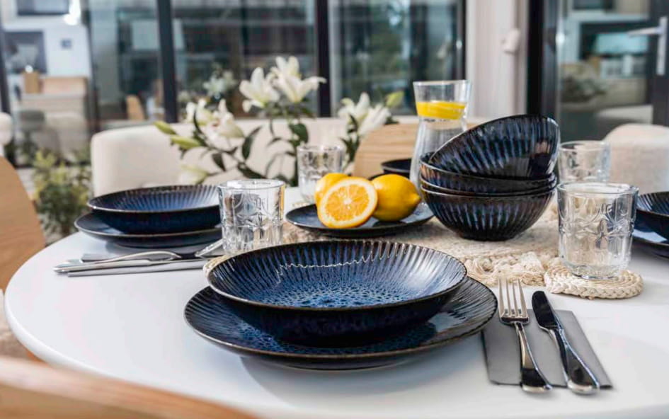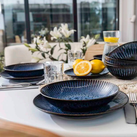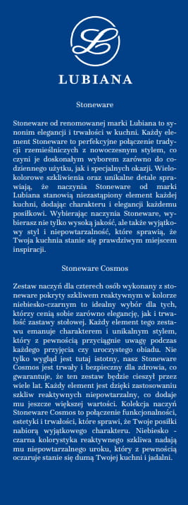 Kolekcja naczyń Stoneware Cosmos to połączenie funkcjonalności, estetyki i trwałości, które sprawi, że Twoje posiłki nabiorą wyjątkowego charakteru. Niebiesko-czarna kolorystyka reaktywnego szkliwa nadają mu niepowtarzalnego uroku, który z pewnością oczaruje wszystkich Twoich gości. To nie tylko zestaw naczyń, to prawdziwe dzieło sztuki stołowej, które stanie się dumą Twojej kuchni i jadalni.