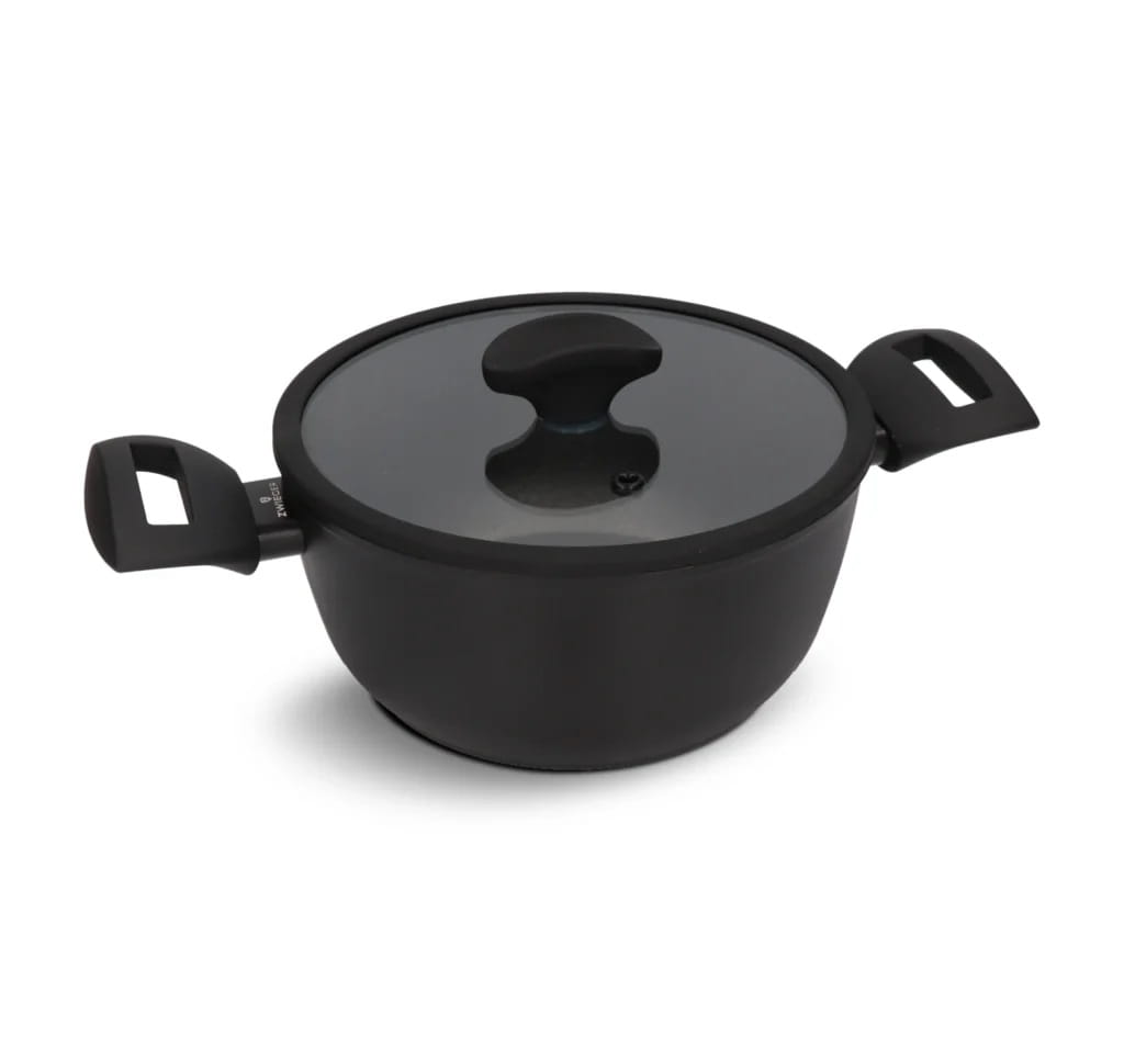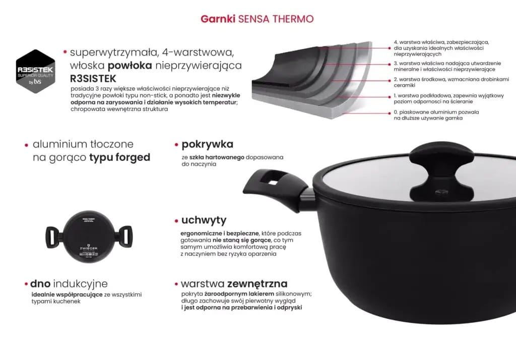 Garnek wykonany został z aluminium tłoczonego na gorąco typu forged. Warstwę wewnętrzną naczynia pokryto wyjątkowo odporną na ścieranie powłoką R3SISTEK. Jest to nowa jakość w dziedzinie powłok nieprzywierających – 4-warstwowa, nieprzywierająca, odporna na zarysowania powłoka powstała dzięki opracowaniu przełomowej technologii, którą jest specjalny proces utwardzania mineralnie jej środkowych warstw. Dzięki temu R3SISTEK oprócz doskonałych właściwości nieprzywierających charakteryzuje się niespotykaną twardością i odpornością na zarysowania. Górna warstwa powłoki pokryta jest odpornymi na ścieranie zgrubieniami, które ją zabezpieczają i sprawiają, że nawet metalowe narzędzia kuchenne płynnie przesuwają się po całej powierzchni. Dzięki swojej wyjątkowej grubości (>100 µm) powłoka R3SISTEK posiada 3 razy większe właściwości nieprzywierające w porównaniu do typowych powłok typu non-stick. Ponadto jest niezwykle odporna na działanie wysokich temperatur, dlatego poza zwykłym smażeniem umożliwia również przygotowywanie posiłków metodą bez tłuszczu. Na zewnątrz garnek pokryto żaroodpornym lakierem silikonowym, dzięki czemu warstwa ta jest odporna na przebarwienia i odpryski, a tym samym naczynie długo zachowuje swój pierwotny wygląd. Garnek Sensa Thermo równomiernie rozprowadza i akumuluje ciepło oraz idealnie współpracuje z wszystkimi rodzajami kuchenek, także indukcyjnymi. Naczynie posiada dopasowaną pokrywę ze szkła hartowanego oraz ergonomiczne i bezpieczne uchwyty, które podczas gotowania nie staną się gorące, co tym samym umożliwia komfortową pracę z naczyniem bez ryzyka oparzenia.