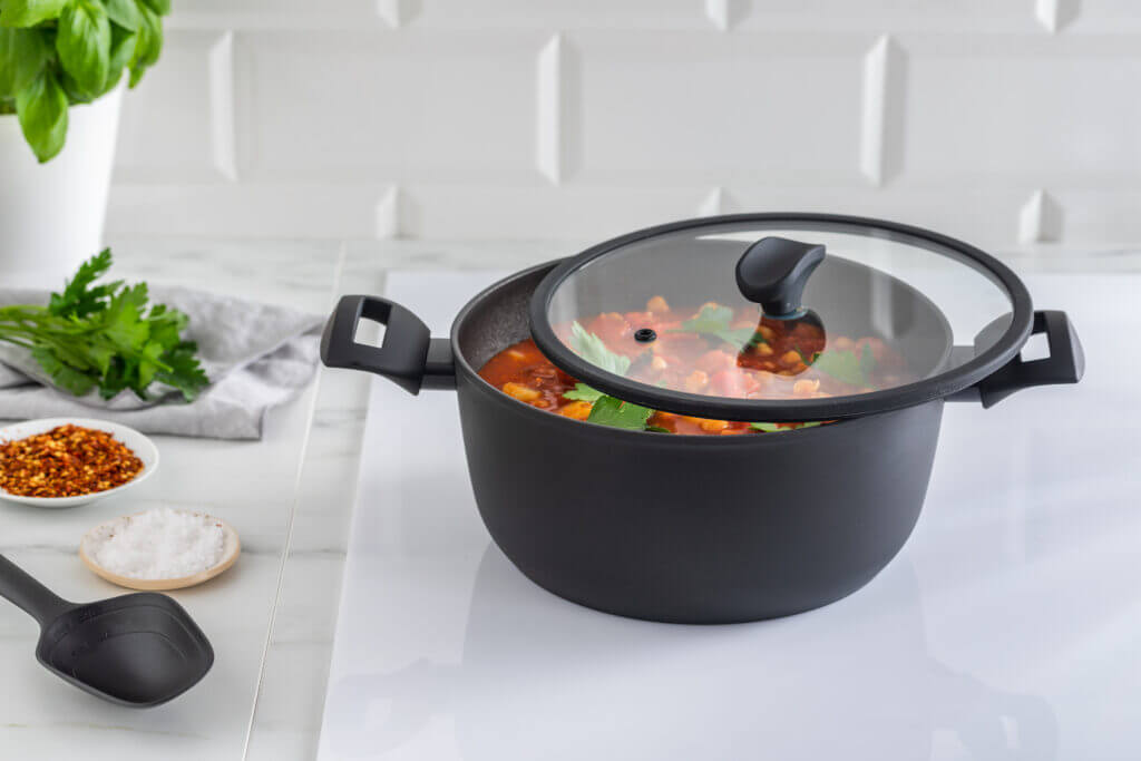 - POKRYWKA – bezpieczne szkło hartowane połączone z uszczelniającym, silikonowym rantem oraz wygodny w użyciu, nienagrzewający się uchwyt