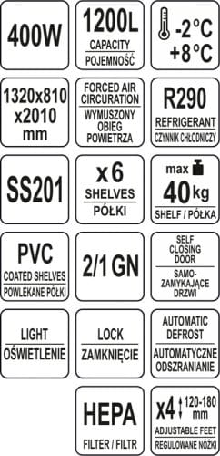 Szafa chłodnicza o wymiarach 1340x810x2010mm ma pojemność komory 1200L - standard GN 2/1